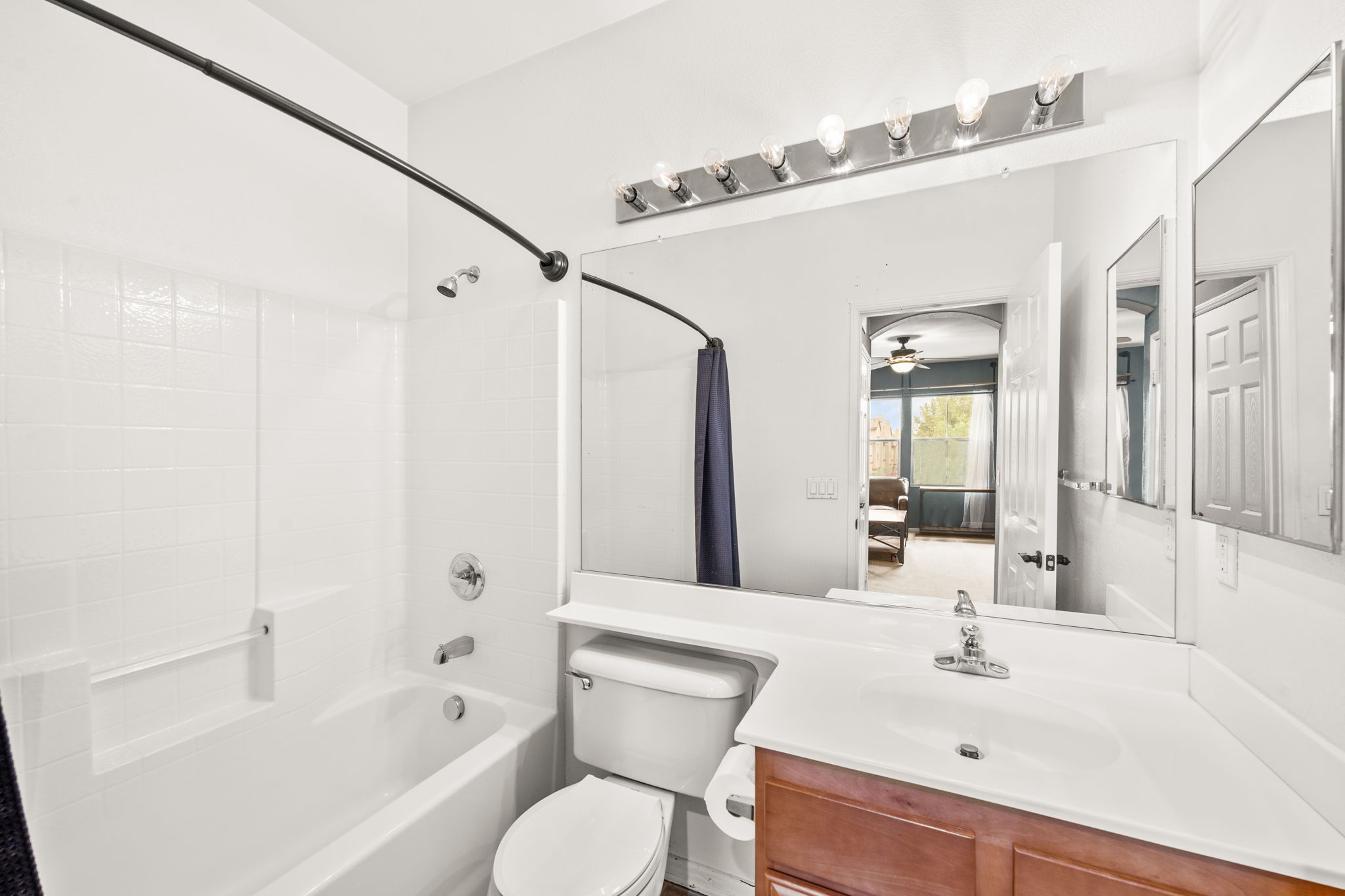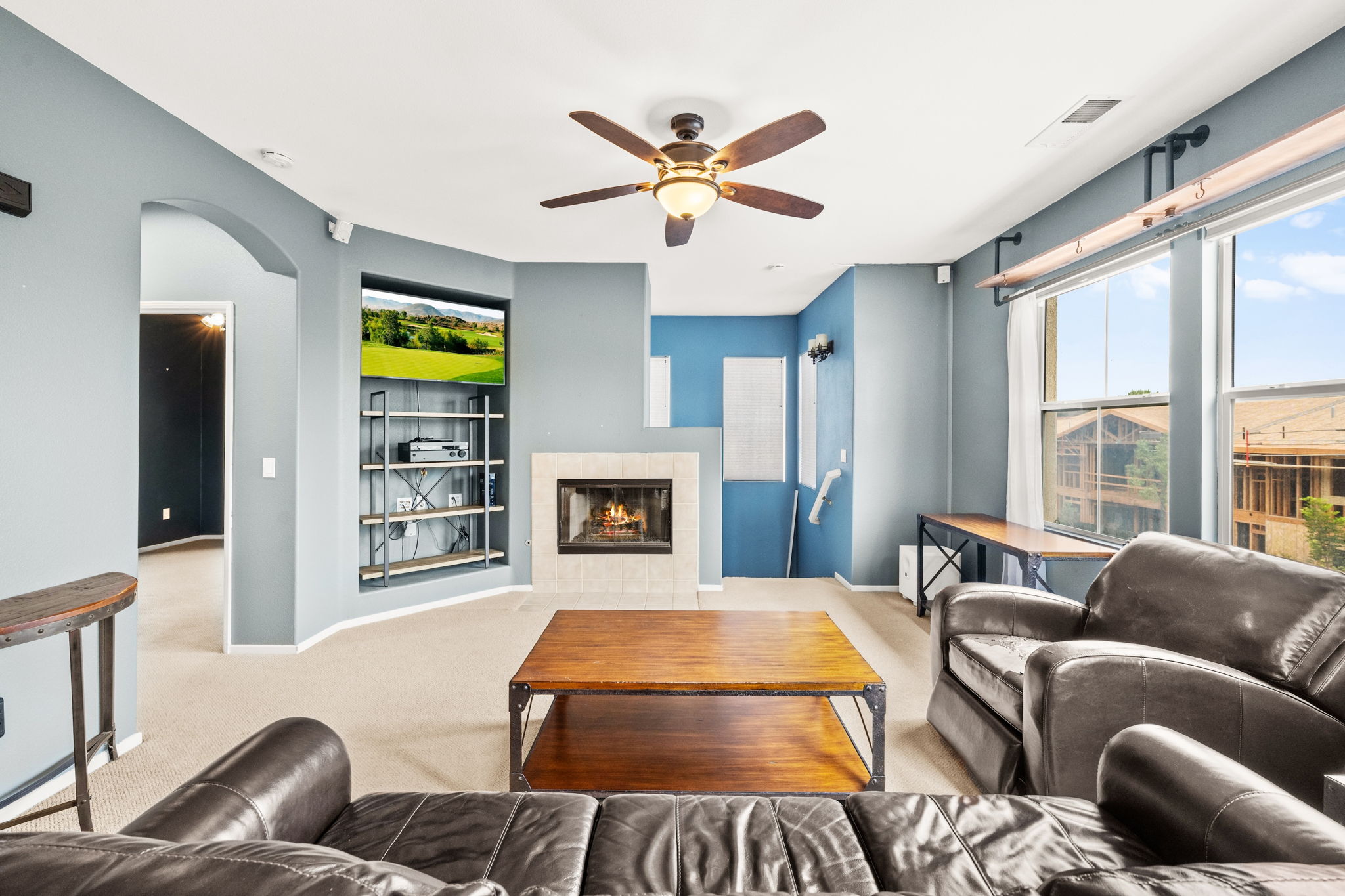 The living room features a cozy fireplace, creating a warm and inviting space to relax. Bedrooms are thoughtfully situated on opposite sides of the home, offering added privacy—great for roommates, guests, or a home office setup.